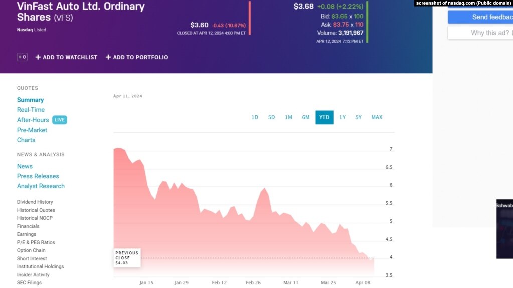 Giá cổ phiếu của hãng xe hơi Việt Nam VinFast rơi xuống mức đáy mới, thấp nhất từ trước đến nay, là 3,6 đô la khi thị trường Nasdaq ở Mỹ đóng cửa hôm thứ Sáu 12/4. Chỉ một ngày trước hãng tin Reuters đăng bài phân tích dài chỉ ra rằng VinFast thua lỗ nặng, tạo ra rủi ro cho cả tập đoàn mẹ là Vingroup.