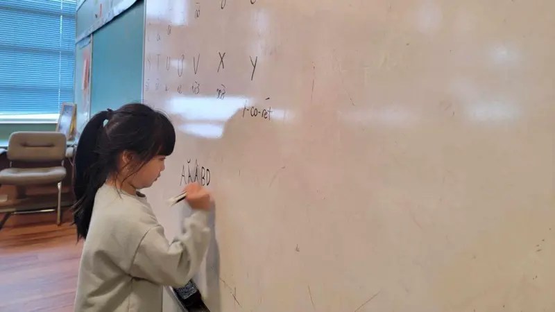 Con tôi năm nay bảy tuổi, đang học lớp 1 trong hệ thống giáo dục ở Mỹ. Vào cuối tuần, tôi cho con đi học tiếng Việt. Mỗi buổi học hơn hai giờ. Bé theo học tiếng Việt đã được 2 năm.