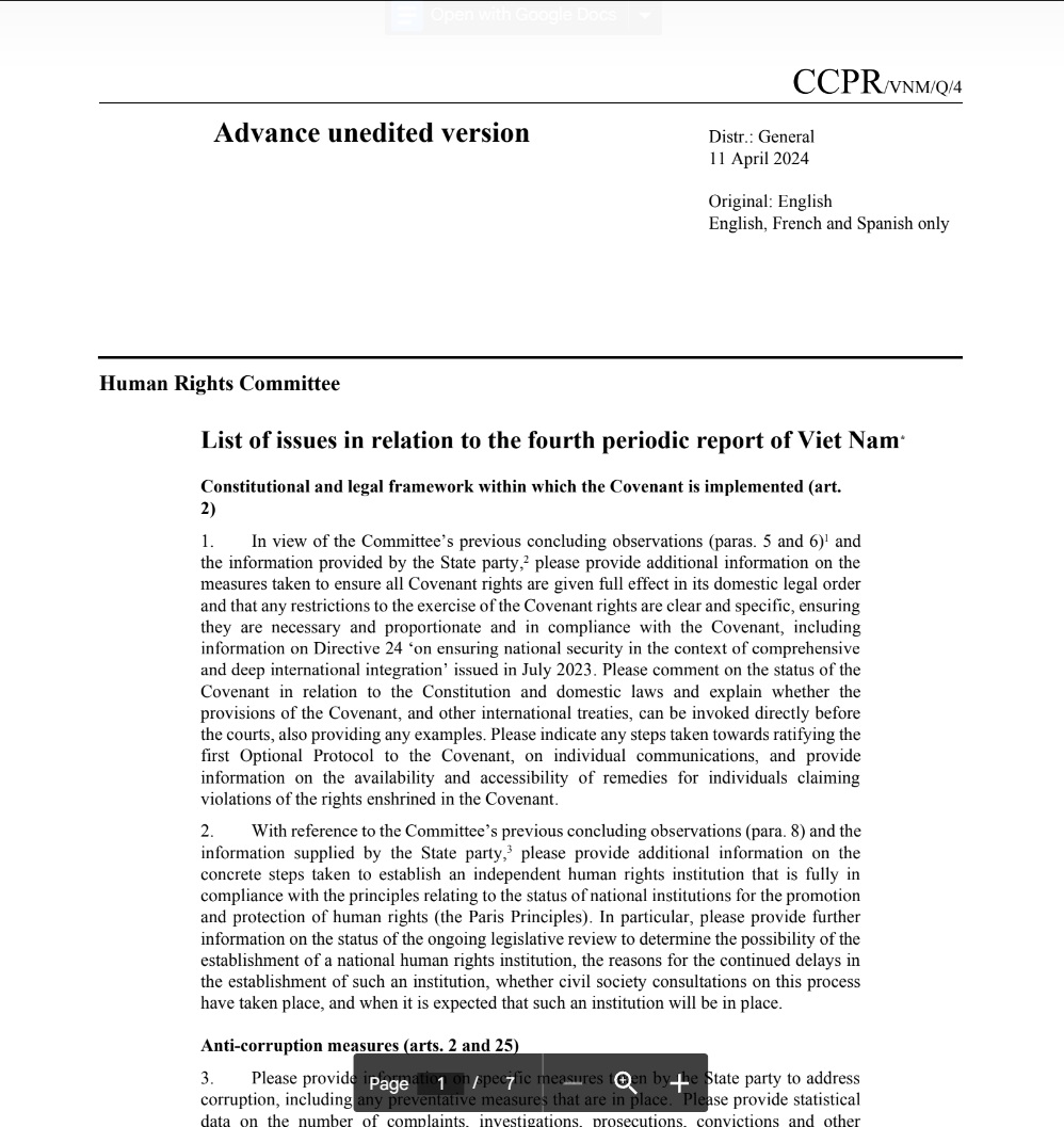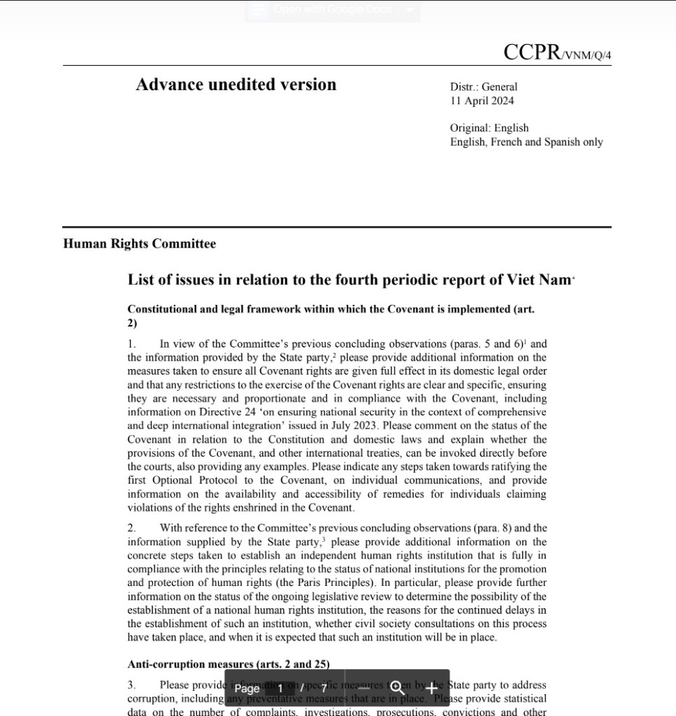 Phiên kiểm điểm UPR cho Việt Nam sẽ diễn ra ngày 7/5/2024. Phiên kiểm kiểm ICCPR, về quyền dân sự và chính trị, hiện nay chưa có ngày chính xác.