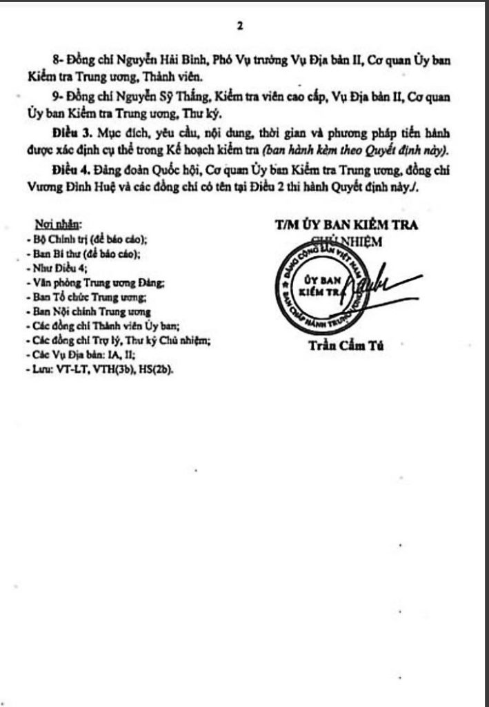 Tổng Bí thư Nguyễn Phú Trong và Thường trực Ban Bí thư, Trưởng Ban Tổ chức Trung ương Trương Thị Mai cũng đồng ý, đề nghị trước mắt theo quy trình, Uỷ ban Kiểm tra Trung ương cùng với Ban Bảo vệ Chính trị Nội bộ Trung ương khẩn trương điều tra mở rộng, báo cáo kết quả cho Tổng Bí thư và Bộ Chính trị, sau đó Ban Bí thư triệu tập hội nghị, xin ý kiến của Ban Chấp hành Trung ương.