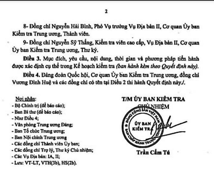 Sau khi Ủy ban Kiểm tra Trung ương công bố quyết định “Tuyệt Mật” số 163-QĐ/UBKTTW ngày 19-4-2024, nội dung “Kiểm tra khi có dấu hiệu vi phạm đối với đồng chí Vương Đình Huệ”, thì năm ngày sau, tức ngày 24-4-2024, ông Huệ đã viết đơn gởi tổng bí thư Nguyễn Phú Trọng, Bộ Chính trị và Ban Bí thư để xin dừng cuộc chơi.