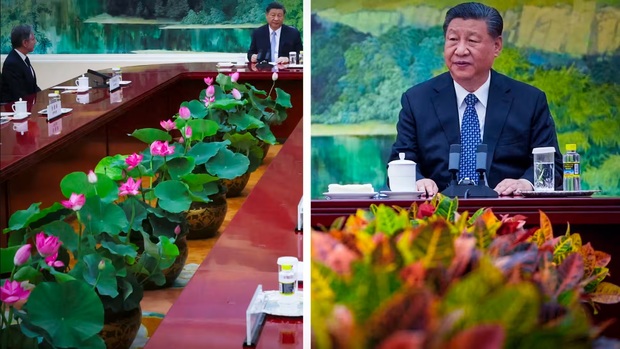 Khi Tập và Blinken gặp nhau tại Hội trường Phúc Kiến cách đây 10 tháng, không gian giữa hai dãy bàn được trang hoàng bằng hoa sen đỏ và nụ sen trắng. Tuy nhiên, hồi tuần trước, những bông hoa đã biến mất, thay vào đó là những chậu cây cô tòng lá đốm (garden croton) không có hoa.