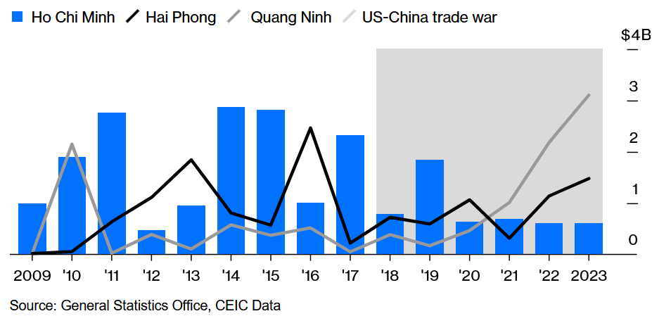 Khi các nhà sản xuất toàn cầu đa dạng hóa chuỗi cung ứng của họ, tiền đã đổ về khu vực phía Bắc, xung quanh thủ đô Hà Nội và cảng phía Đông Hải Phòng. Quảng Ninh, tỉnh ven biển phía đông bắc, nơi có điểm nóng du lịch và Di sản Thế giới Vịnh Hạ Long, là tỉnh nhận đầu tư trực tiếp nước ngoài lớn nhất trong năm ngoái. Autoliv Inc., công ty sản xuất hệ thống an toàn ô tô Thụy Điển đang lên kế hoạch xây dựng một nhà máy trị giá 160 triệu USD ở đó, cũng như nhà cung cấp ô tô Boltun Corp. có trụ sở tại Đài Loan, chỉ là một số tên có thể kể ra.