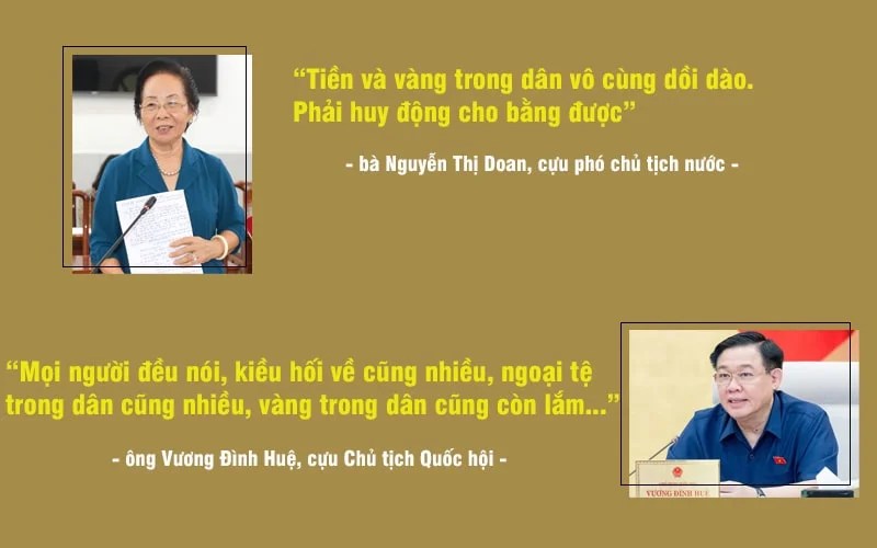 Trong một phát biểu năm 2017, bà Nguyễn Thị Doan, cựu phó chủ tịch nước, cũng cho rằng tiền và vàng trong dân vô cùng dồi dào, phải tìm cách huy động cho bằng được. Lúc đó bà Doan nói: “Tại sao Bác Hồ huy động được nhiều vàng trong dân và có người hiến tặng đến 5.000 lạng vàng cho đất nước. Thế mà sau này không thấy có trường hợp nào như thế nữa. Tại sao Bác tạo được nhiều động lực và huy động được nguồn lực như vậy? Đây là vấn đề chúng ta phải nghiên cứu”. (3)