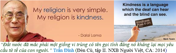 Tôi xin phép được thưa thêm: khi xếp thứ hạng về tử tế của Việt Nam trên thế giới đứng hạng chót thì tưởng cũng cần phải nói cho rõ là những con số này chỉ “thể hiện” sự tiểu tâm, ti tiện, bạc ác, và đểu cáng của đám “lãnh đạo” (đầu trâu mặt ngựa) ở xứ sở này chứ không liên quan dính dáng gì đến người dân Việt cả.