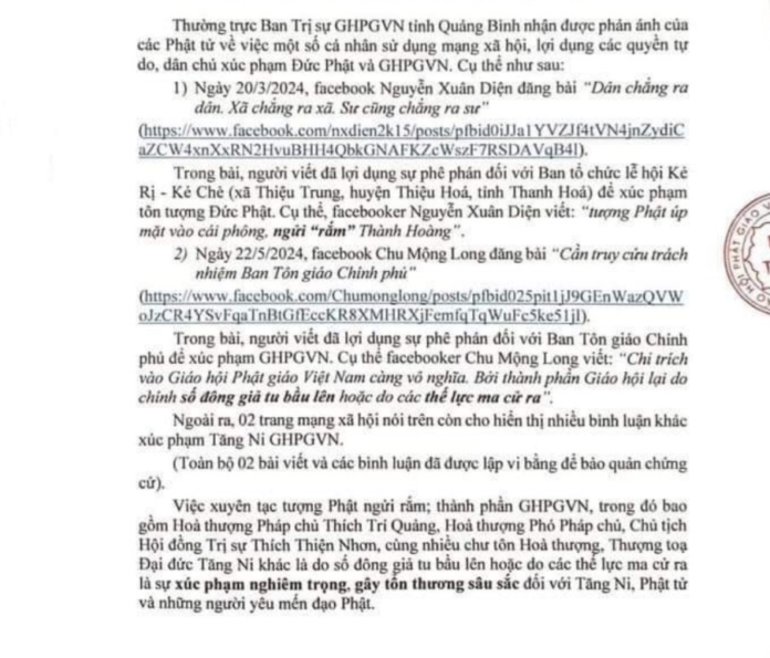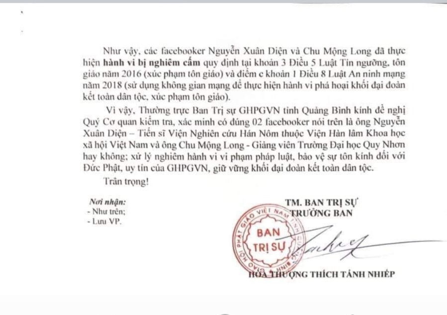Ban Trị sự Giáo hội Phật giáo Quảng Bình ra công văn đe dọa Nguyễn Xuân Diện và Chu Mộng Long vi phạm gì đó và đòi chính quyền xử lý. Nguyễn Xuân Diện thì tôi không rõ, không quan tâm. Cá nhân tôi thì được dẫn ra trong bài: “Cần truy cứu trách nhiệm Ban Tôn giáo chính phủ“. Không ngờ giới tu hành sân hận đến mức đem chính quyền ra đe dọa.