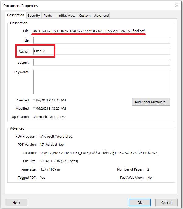 Tác giả file báo cáo này cũng không phải ông Vương Tấn Việt. Tác giả file này là Kim Liễu, nhiều khả năng là TS Trần Kim Liễu, một trong hai người hướng dẫn khoa học của ông Vương Tấn Việt.
