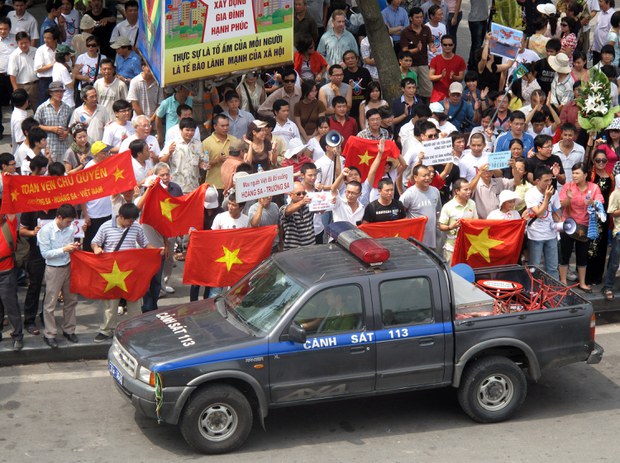 Xe của công an đi qua đám đông người biểu tình phản đối Trung Quốc ở Hà Nội hôm 7/8/2011 (minh hoạ) – REUTERS/John Ruwitch