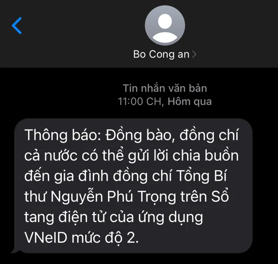 Bộ Công An thông báo: “Đồng bào, đồng chí cả nước có thể gửi lời chia buồn đến gia đình đồng chí Tổng Bí thư Nguyễn Phú Trọng trên Sổ tang điện tử của ứng dụng VNelD mức độ 2“.