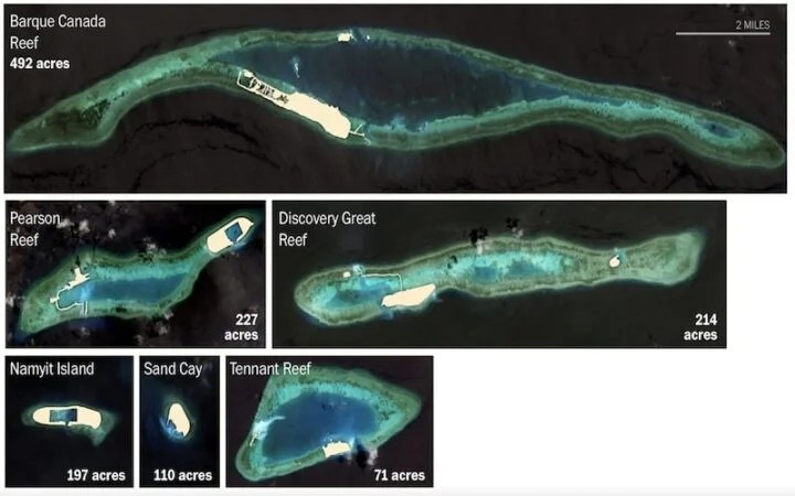 Từ năm 2013 đến năm 2015, Trung Quốc đã tiến hành một cuộc tấn công xây dựng đảo ở quần đảo Trường Sa, cải tạo khoảng 12.000 m2 đất, sau đó xây dựng các căn cứ quân sự hoàn chỉnh với hệ thống tên lửa chống hạm và phòng không, radar và máy bay chiến đấu.