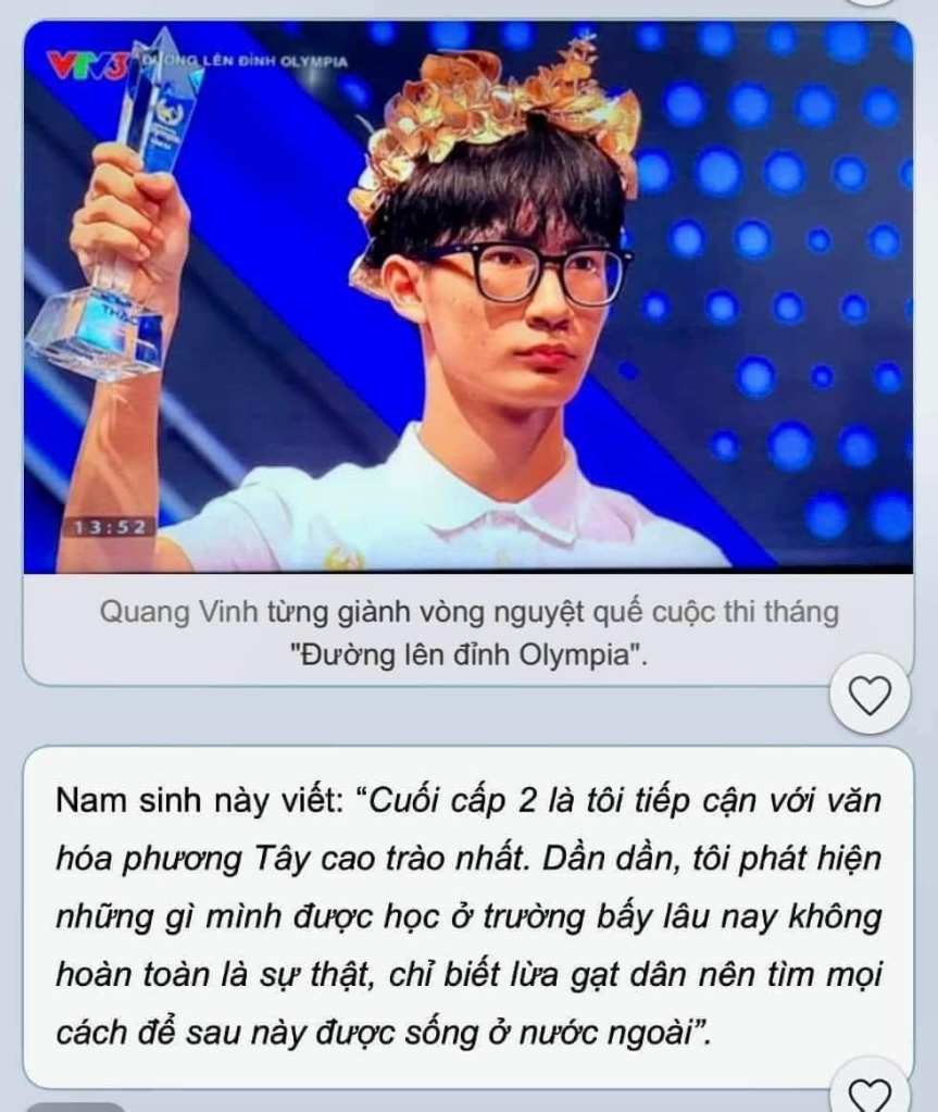Em Chu Phạm Quang Vinh ở Yên Bái – người từng giành ngôi vô địch, mang về vòng nguyệt quế cuộc thi tháng 1, quý I, Đường lên đỉnh Olympia năm thứ 24 có dòng trạng thái gây tranh luận.