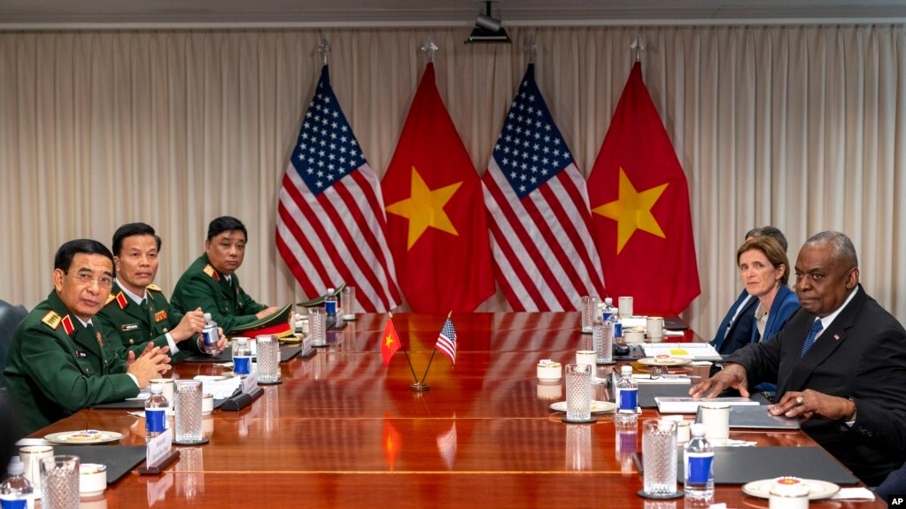 Nhà lãnh đạo quốc phòng Mỹ nhắc lại chuyến thăm Hà Nội của Tổng thống Mỹ Joe Biden vào tháng 9 năm ngoái và hai bên đã nâng quan hệ lên tầm Đối tác Chiếc lược Toàn diện.