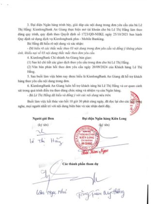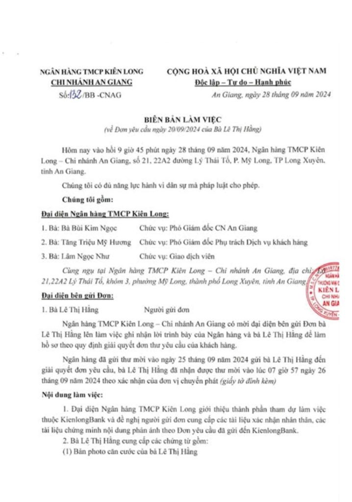 Ảnh chụp biên bản làm việc giữa bà Lê Thị Hằng, mẹ cô Tô Lê Ánh Nguyệt, với Ngân hàng Kiên Long, chi nhánh An Giang: