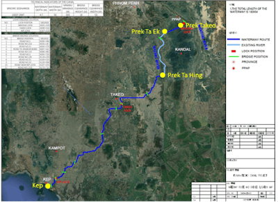 Một dòng kênh song song với xa lộ từ Phnom Penh đến Sihanoukville sẽ miễn phải thuyên chuyển hàng từ phương tiện vận tải này sang phương tiện khác. Cộng với xa lộ và đường sắt, dòng nước này sẽ tạo ra mô hình ba loại hạ tầng vận tải song song như KS Charles de Freycinet đã áp đặt vào cuối thế kỷ XIX để đáp ứng nhu cầu giao thong vận tải của cách mạng công nghiệp thứ nhất của Pháp. Nếu cần phải dùng một phương tiện có trọng tải 3.000 DWT thì sà lan tiêu chuẩn Grand Rhenan là thích hợp vì chỉ cần đến một dòng nước sâu 3,80 mét.
