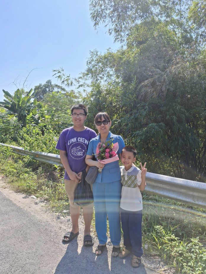 Thăm chồng xong, trên đường ra khỏi trại mới nhẹ lòng để chụp một tấm ảnh. Bó hoa Tử Đinh Hương cầm trên tay là quà tặng nhân dịp kỉ niệm 15 năm ngày cưới của chồng.