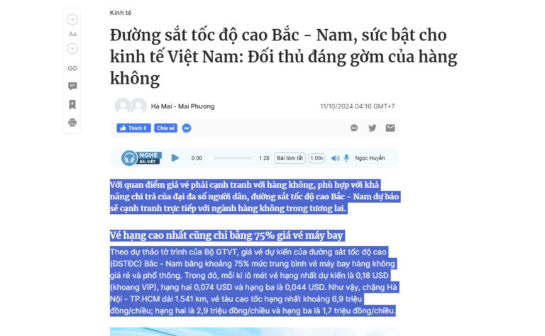 Một bài báo lớn về đường sắt cao tốc kéo cái tựa đề làm những người hay đi máy bay thấy … nhột. Đó là dòng chữ lớn: Đường sắt cao tốc Bắc Nam, sức bật cho nền kinh tế Viêt Nam: Đối thủ đáng gờm của hàng không.