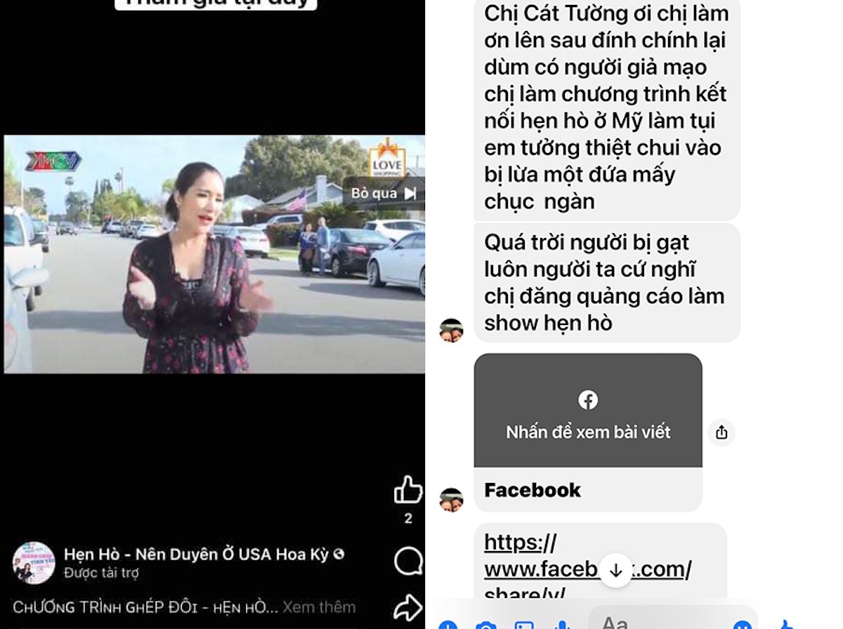 Theo lời cô Cát Tường, trang Facebook “Hẹn Hò-Nên Duyên ở USA Hoa Kỳ” chạy quảng cáo trên mạng xã hội để thu hút nhiều con mồi.