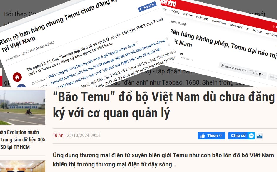 Riêng, Tạp chí Công thương “kể công” cho bộ cùng tên bằng tựa “Sau phản ánh, Temu xin cấp phép hoạt động ở Việt Nam“, ý nói: Chiều 23 Tháng Mười, trong cuộc họp báo thường kỳ, thứ trưởng Bộ Công thương Nguyễn Sinh Nhật Tân cho biết “Temu chưa đăng ký hoạt động tại Việt Nam, và Bộ giao cho Cục thương mại điện tử và kinh tế số (TMĐT&KTS) và Tổng cục Quản lý Thị trường đánh giá tác động của Temu”. Chỉ nửa ngày sau (24 Tháng Mười), Temu vội vàng đăng ký với Bộ!