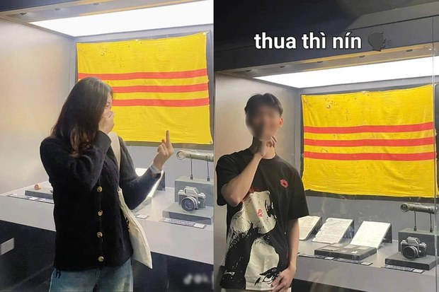 Một số bạn trẻ bày tỏ niềm vui và tự hào khi chụp ảnh với lá cờ vàng Việt Nam Cộng Hòa trong Bảo tàng lịch sử quân sự Việt Nam với các cử chỉ phản cảm.