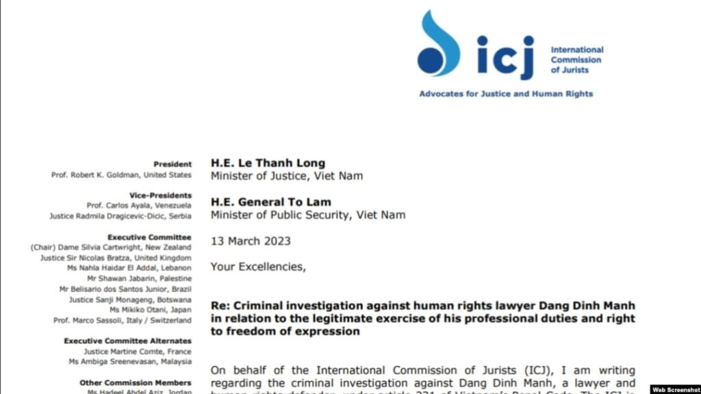 Trước đó, vào trung tuần tháng 3 năm 2023, Ủy ban Luật gia Quốc tế (ICJ) đã gởi kháng thư đến Bộ Trưởng Bộ Tư pháp Lê Thanh Long và Bộ Trưởng Bộ Công an Tô Lâm. Nội dung thư lên án việc điều tra hình sự đối với luật sư nhân quyền Đặng Đình Mạnh theo cáo buộc “Lợi dụng các quyền tự do dân chủ”.
