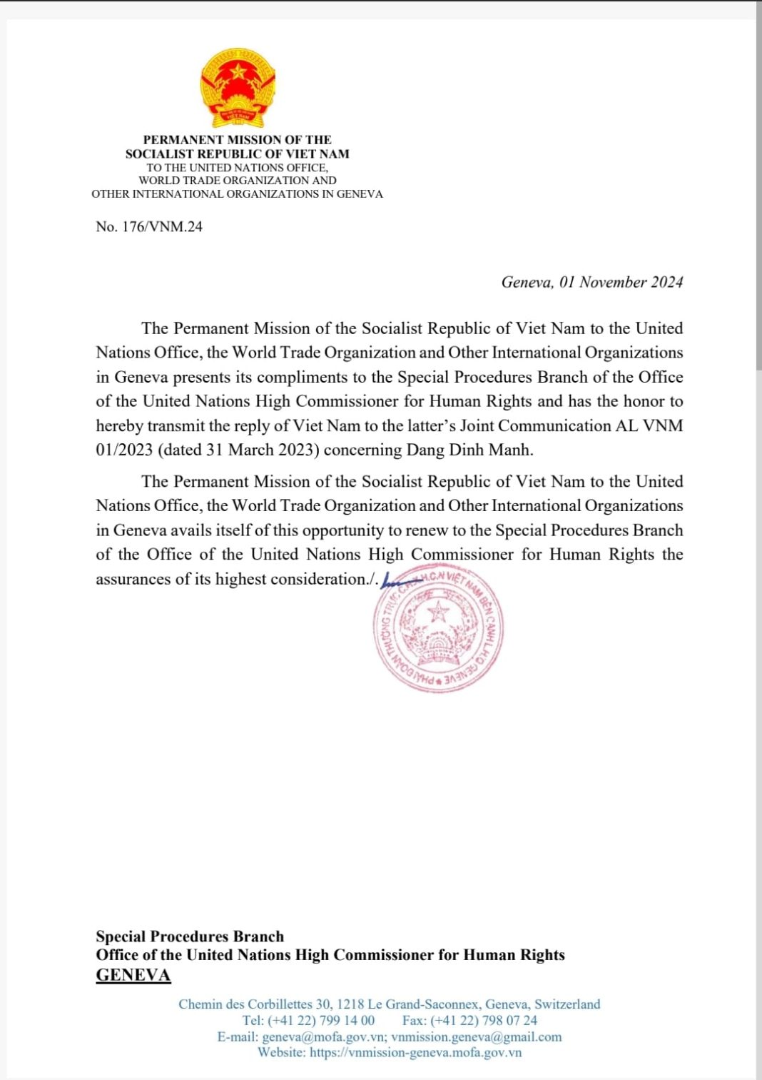 Sau khoảng 20 tháng giữ thái độ im lặng, ngày 01 tháng 11 năm 2024, chính quyền Việt Nam đã trả lời cho LHQ thông qua Phái đoàn Thường trực đặt tại Văn phòng LHQ liên quan đến hồ sơ Đặng Đình Mạnh.