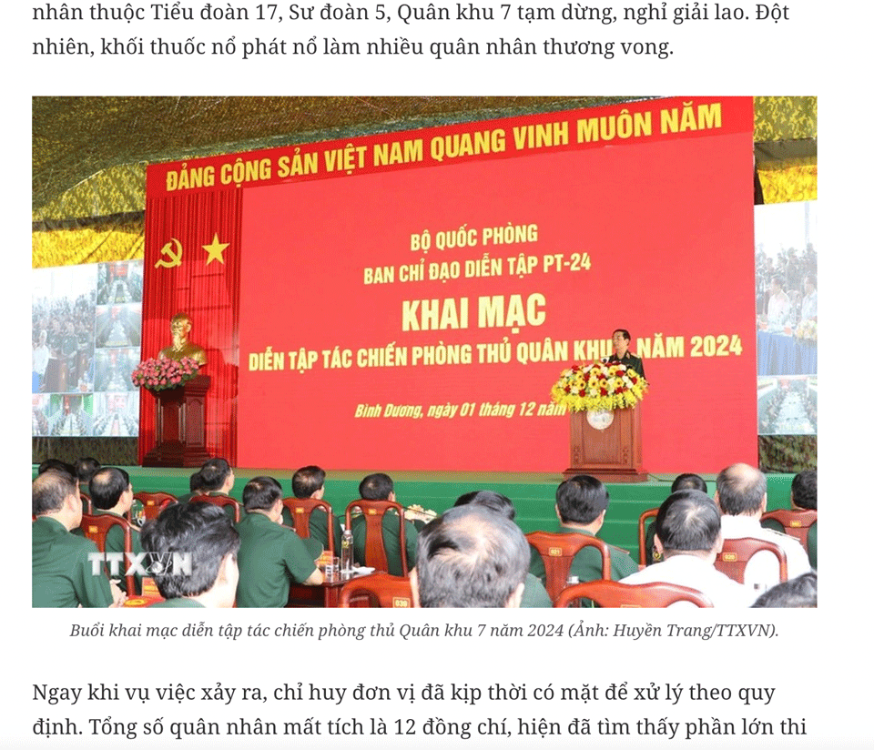 Theo báo trong nước, từ ngày 1 đến ngày 4/12, Quân khu 7 tổ chức diễn tập tác chiến phòng thủ năm 2024. Tuy nhiên, tìm kiếm Google cho thấy tin này trên Báo Quân khu 7 đã được đăng trước đây hai ngày hiện không còn tìm thấy.