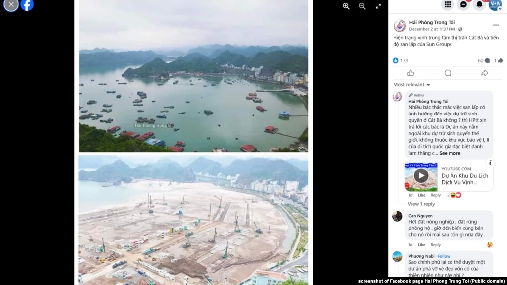Trong những ngày gần đây, dư luận Việt Nam trên mạng xã hội bày tỏ sự ngỡ ngàng, bất bình khi xem hình ảnh được lan truyền cho thấy tập đoàn bất động sản Sun Group san lấp một phần vịnh đảo Cát Bà. Họ cho rằng điều đó không khác gì việc tàn phá thiên nhiên.