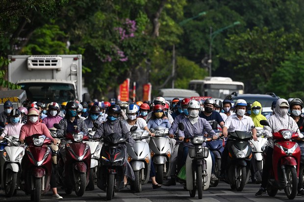 Người tham gia giao thông chờ đèn đỏ ở Hà Nội ngày 05/4/2021 (hình minh hoạ) – AFP