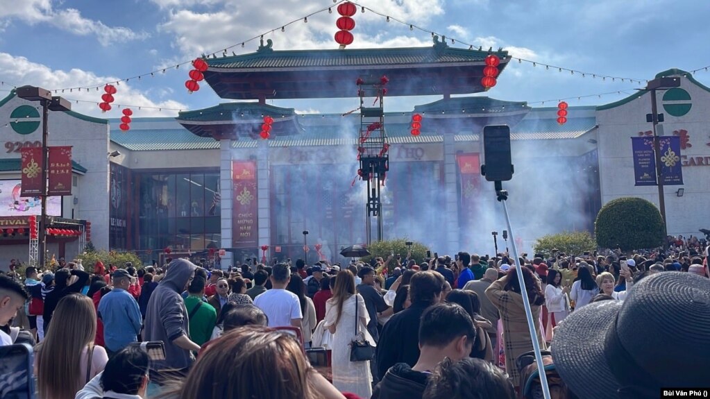 Bên ngoài thương xá tràn ngập khách du xuân, áo dài nhiều màu nhiều kiểu tung bay, tiếng pháo rền vang dù hôm nay là thứ Tư trong tuần, đúng Mồng Một Tết. Lễ hội đang diễn ra, pháo liên hoàn nổ kéo dài có đến 15 phút, mùi pháo và xác pháo đỏ, hồng và những ca khúc đón mùa xuân mới gợi nhớ cho tôi không khí Tết ở quê nhà ngày xưa. Khách du xuân nhiều người được chủ nhân thương xá là ông Triệu Phát và ban tổ chức lì xì phong bì đỏ trong đó có tấm vé số $888 lấy hên đầu năm.