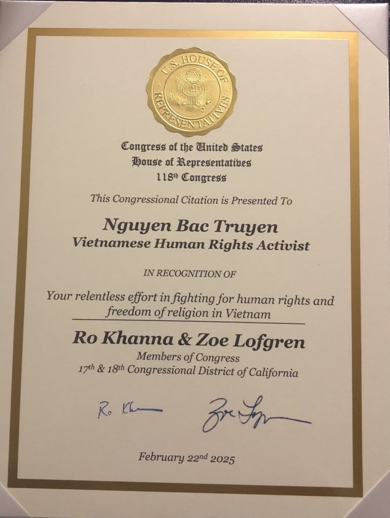 Ngày 22/2/2025, ông Nguyễn Xuân Hiệp – Cố vấn Cao cấp của Dân biểu Liên bang Ro Khanna đại diện 2 vị Dân biểu Liên bang Ro Khanna và Zoe Lofgren trao tặng cựu tù nhân lương tâm Nguyễn Bắc Truyển bằng tưởng lục (giấy khen của Quốc Hội), ghi nhận nỗ lực tranh đấu của ông Truyển cho nhân quyền và tự do tôn giáo tại Việt Nam.