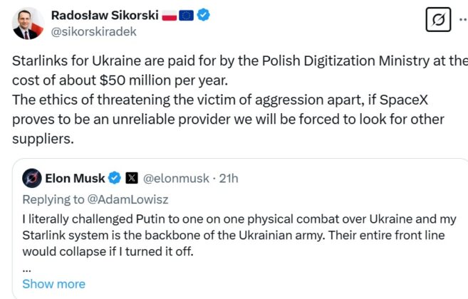 Ngày 9/3/2025, Bộ trưởng Ngoại giao Ba Lan Radoslaw Sikorski tuyên bố rằng Ba Lan sẽ tìm kiếm nhà cung cấp thay thế, nếu SpaceX (của Elon Musk) trở thành một đối tác không đáng tin cậy trong việc cung cấp dịch vụ internet vệ tinh Starlink cho Ukraine.