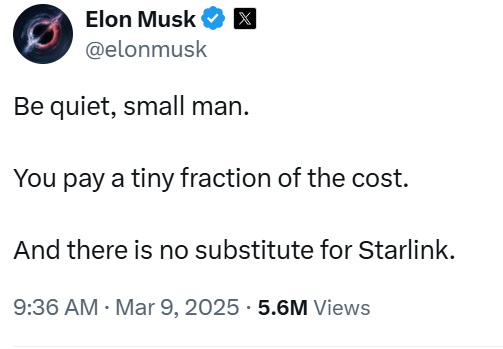 Tuy nhiên, tỷ phú Musk phản bác mạnh mẽ và nói thẳng rằng “ông chỉ trả một phần nhỏ trong số chi phí” và “không có bất kỳ dịch vụ nào có thể thay thế Starlink”.