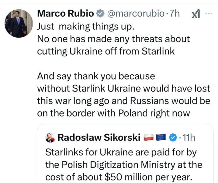 “Không ai đe dọa sẽ cắt Starlink của Ukraine cả”, ông Rubio nói, đồng thời nhấn mạnh: “Và hãy nói lời cảm ơn (Mỹ) đi, vì nếu không có Starlink, Ukraine đã thua cuộc chiến này từ lâu, và quân Nga giờ đã có mặt ngay sát biên giới Ba Lan”.