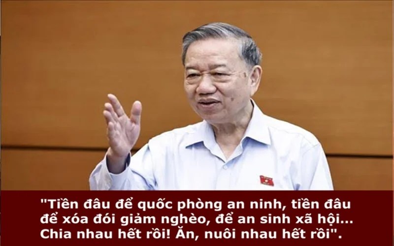 Mạng xã hội gần đây rộ lên video ông Tô Lâm phát biểu rằng “Tiền đâu để quốc phòng an ninh, tiền đâu để xóa đói giảm nghèo, để an sinh xã hội… Những việc đó nhà nước phải lo chứ. Nhưng làm sao mà có được? Chia nhau hết rồi! Ăn, nuôi nhau hết rồi”.
