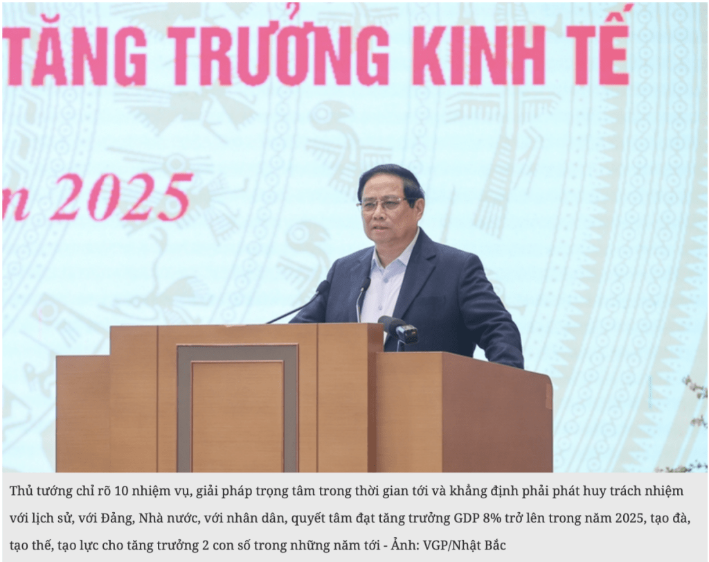 Việt Nam đang đặt mục tiêu tăng trưởng 8% trong năm 2025 và sẽ lên hai con số từ năm 2026 trở đi. Mức tăng trưởng cao này sẽ tiếp tục trong hai thập kỷ. Vì sao lại có con số này? Thông điệp khá rõ ràng, lãnh đạo Việt Nam đang quyết tâm thoát bẫy thu nhập trung bình.