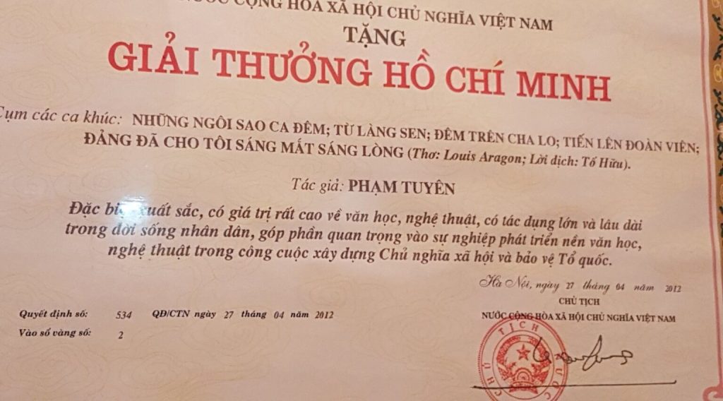 Rồi cuối cùng, người ta cũng miễn cưỡng trao giải cụ Hồ cho ông nhạc sĩ già, vào năm 2012, do Trương Tấn Sang ký, chả biết có phải một phần do nghe được lời phàn nàn tâm sự kia không. Bài “Tiến lên đoàn viên” nằm trong cụm 5 tác phẩm được giải Hồ Chí Minh, có lẽ xứng đáng nhất, chứ 4 bài kia rất xoàng (gồm: Những ngôi sao ca đêm, Từ làng Sen, Đêm Cha Lo, Đảng đã cho tôi sáng mắt sáng lòng). Thế mới biết chuyện xét giải ở xứ này nhiều khi rất cảm tính, hời hợt, định kiến, nhố nhăng.