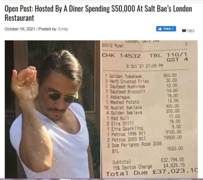 Theo dân sành điệu, ước tính bữa ăn thịt bò dát vàng hôm ấy của Lâm do chính tay thánh rắc muối Salt Bae Nusret Gökçe phục vụ với giá không dưới 37 ngàn bảng Anh, tức gần 50.000 Mỹ kim, tương đương 1,2 tỷ VNĐ.
