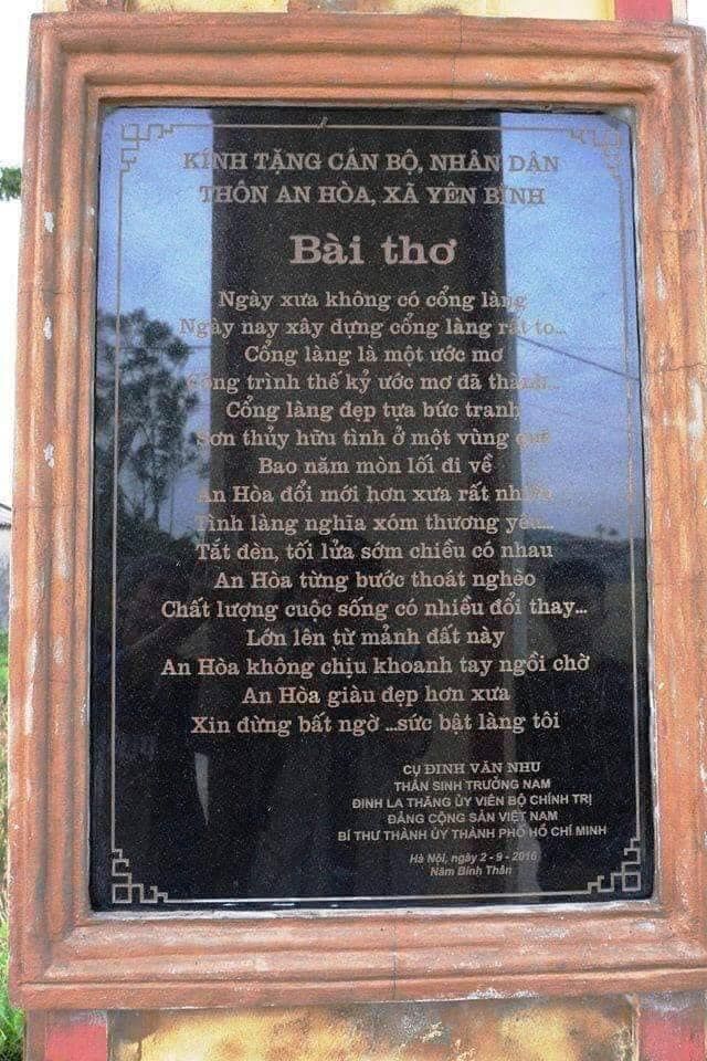 Ông Đinh Văn Nhu là ai, không mấy người biết, bỗng dưng được in ra mấy tập thơ, có cả bài thơ viết trên bia đá lưu lại hậu thế mới khiếp. Sau này người ta mới biết, chính ông là cha đẻ của Đinh La Thăng, cựu Ủy viên Bộ Chính trị. Khi Đinh La Thăng bị tống tù, buồn vì con trai, ông Nhu ra đi không lời ly biệt, thơ ông cũng chết chôn chết tiệt luôn.