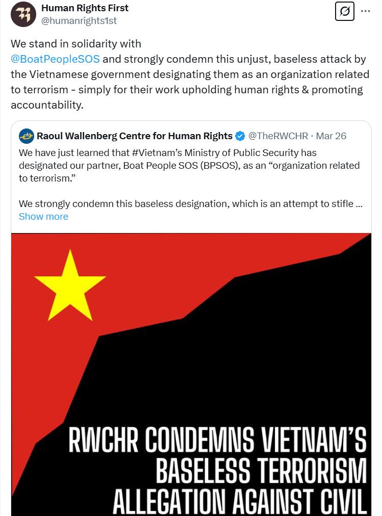Hưởng ứng phát biểu của họ trên x.com, tổ chức Hoa Kỳ Human Rights First viết ngày 28/3: