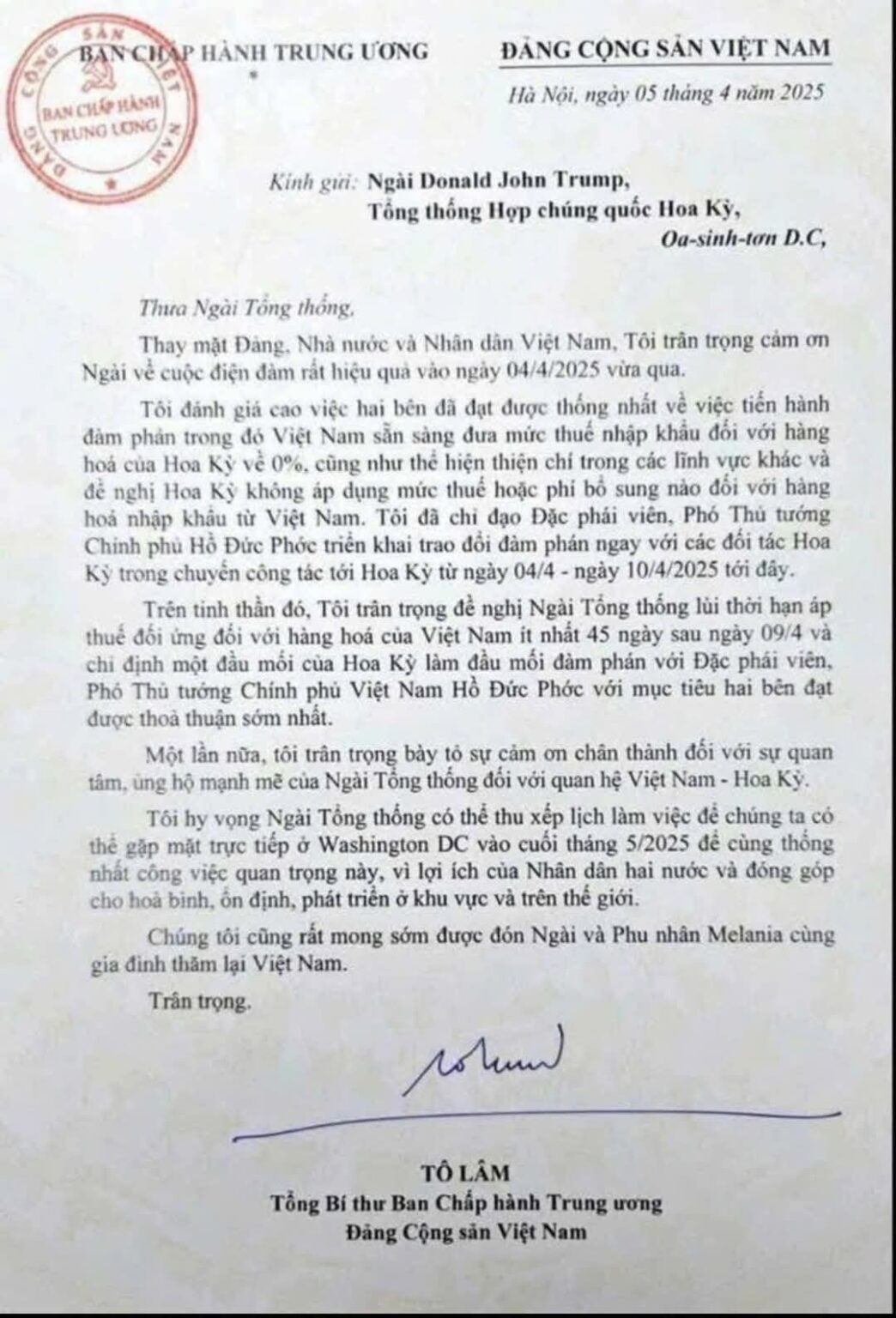 Theo một bản sao mà The New York Times có được, đề xuất của ông Tô Lâm gửi tới Tổng thống Trump đã được nêu trong một bức thư hôm thứ Bảy. Trong thư, ông Tô Lâm kêu gọi ông Trump chỉ định một đại diện của Mỹ để dẫn đầu các cuộc đàm phán với Phó thủ tướng Việt Nam Hồ Đức Phớc, “với mục tiêu đạt được thỏa thuận sớm nhất có thể“.