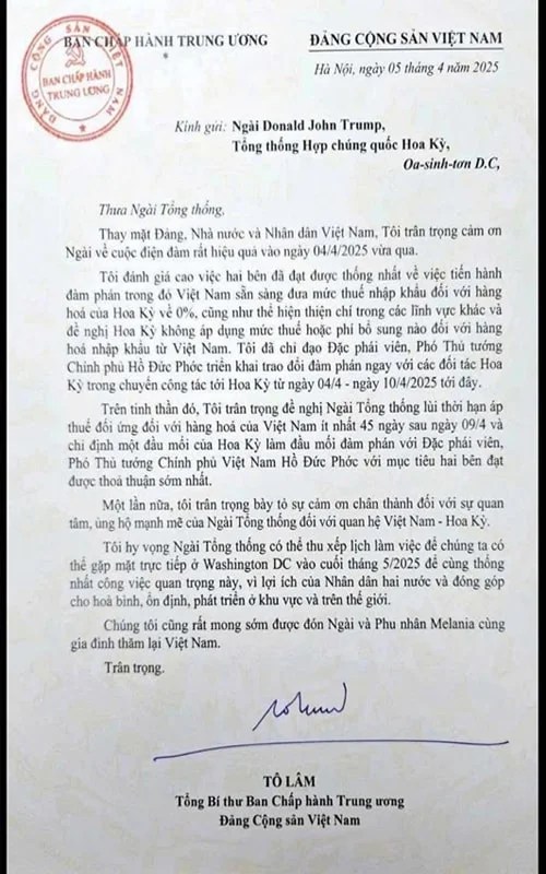 Tiếp theo đó, sáng hôm sau, 5/4, Tô Lâm gửi thư cho Trump để xin được áp thuế 0% cho hàng Mỹ. Nhưng nhìn vào nội dung bức thư là thấy trình độ ẩu tả đến tệ hại của các cố vấn ông tổng bí thư. Ngay cả tên thủ đô Mỹ cũng không thống nhất cách viết, đầu thư thì ghi là “Oa-sinh-ton D.C”, cuối thư lại viết thành “Washington DC”.