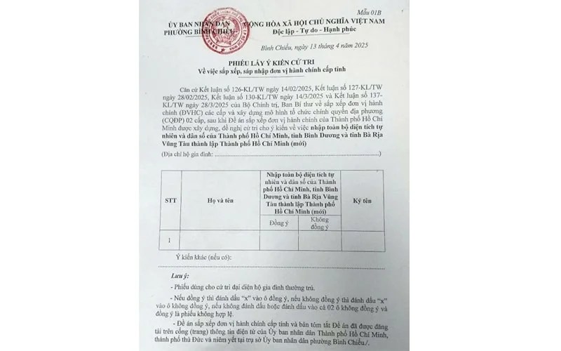 Sáng 13/4, người dân nhiều phường ở Thủ Đức bất ngờ nhận được phiếu lấy ý kiến về việc sáp nhập toàn bộ diện tích tự nhiên và dân số Thành Hồ với tỉnh Bình Dương, Bà Rịa – Vũng Tàu để lập TP HCM mới.