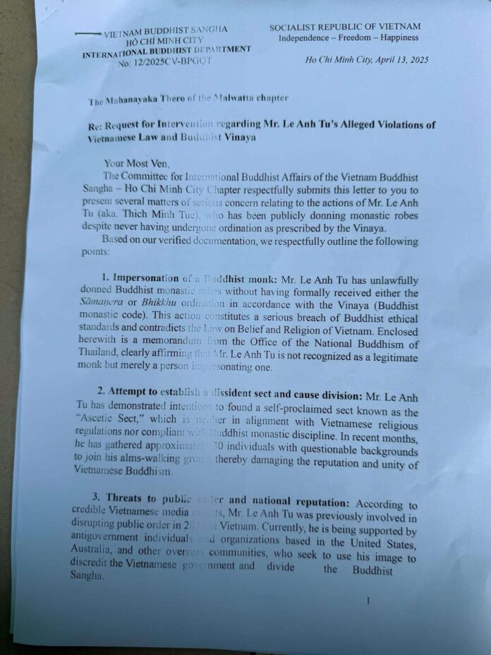 Về việc: Yêu cầu can thiệp đối với hành vi vi phạm luật pháp Việt Nam và giới luật Phật giáo của ông Lê Anh Tú (tức Thích Minh Tuệ)