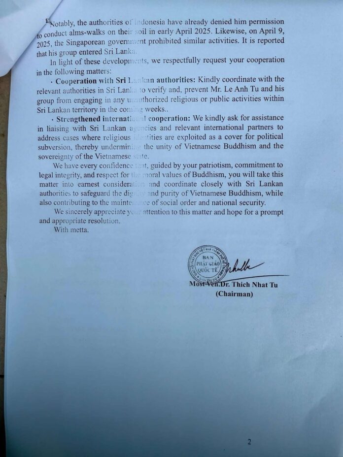 Hợp tác với chính quyền Sri Lanka: Ngăn chặn ông Tú và nhóm của ông thực hiện các hoạt động tôn giáo không được phép tại Sri Lanka.