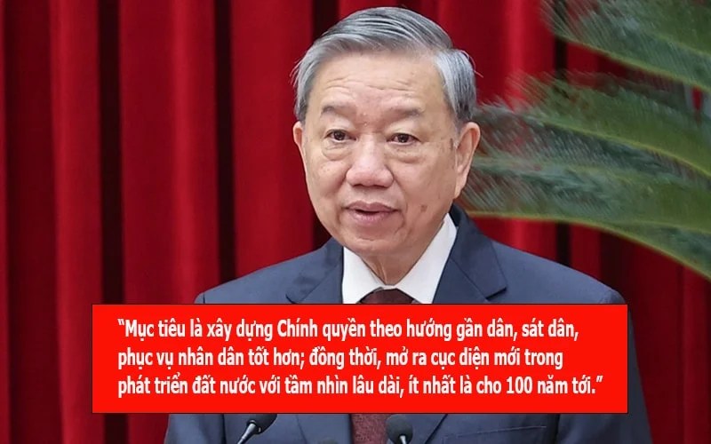 “Mục tiêu là xây dựng Chính quyền theo hướng gần dân, sát dân, phục vụ nhân dân tốt hơn; đồng thời, mở ra cục diện mới trong phát triển đất nước với tầm nhìn lâu dài, ít nhất là cho 100 năm tới.” — Phát biểu của Tô Lâm.