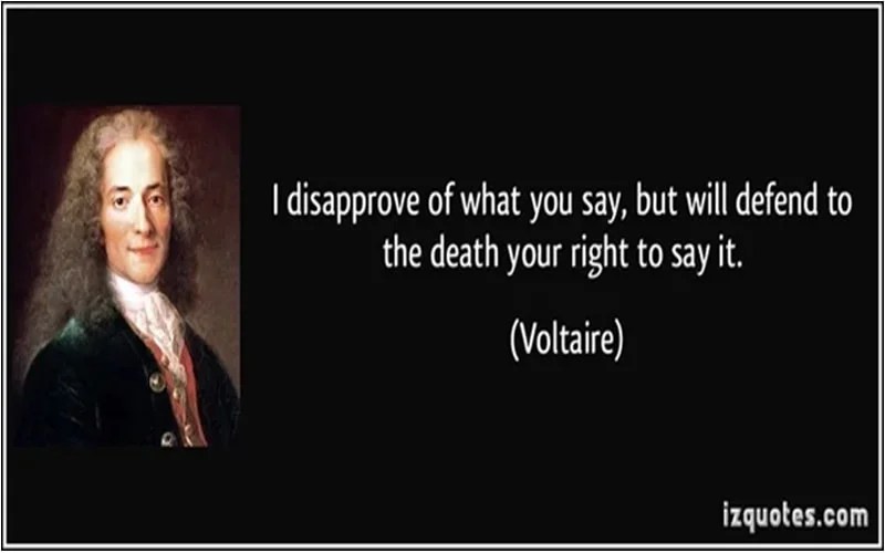 Triết gia Khai sáng người Pháp Voltaire cho rằng – Tôi không đồng tình với những gì bạn nói, nhưng tôi sẽ bảo vệ đến chết quyền được nói của bạn. Ở nơi tôi ở, ý kiến của ông thường được trích dẫn rộng rãi như một tuyên ngôn về quyền tự do ngôn luận.
