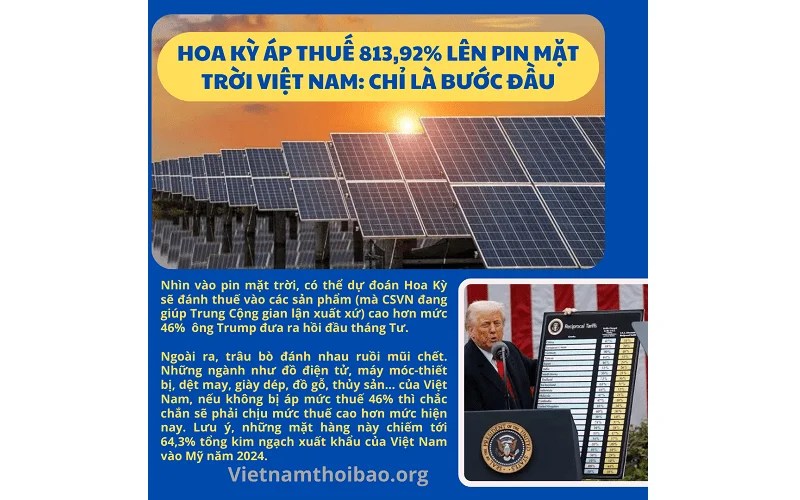 Và pin năng lượng mặt trời chỉ mới là bước đầu trong tiến trình đánh thuế của Hoa Kỳ lên các nước tiếp tay gian lận thương mại cho Trung Cộng. Tiếp theo đó sẽ là thép, nhôm, xe hơi, phụ tùng xe hơi, chất bán dẫn, các sản phẩm năng lượng mà CSVN đang giúp Trung Cộng gian lận xuất xứ. Nhìn vào pin mặt trời thì có thể dự đoán Hoa Kỳ sẽ đánh thuế vào những ngành này cao hơn mức 46% mà ông Trump đưa ra hồi đầu tháng Tư.