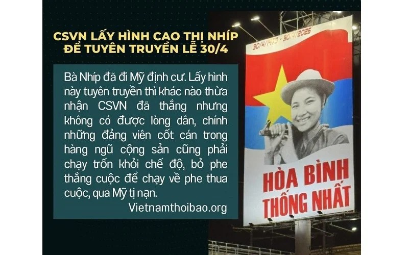 Thành Hồ mấy ngày gần đây có làm nhiều áp phích đưa hình bà Cao Thị Nhíp để tuyên truyền về lễ 30/4 sắp tới. Nhưng buồn cười thay khi biết rằng người phụ nữ này hiện nay: đang ở Little Saigon, California, thủ đô người Việt tị nạn tại Hoa Kỳ.