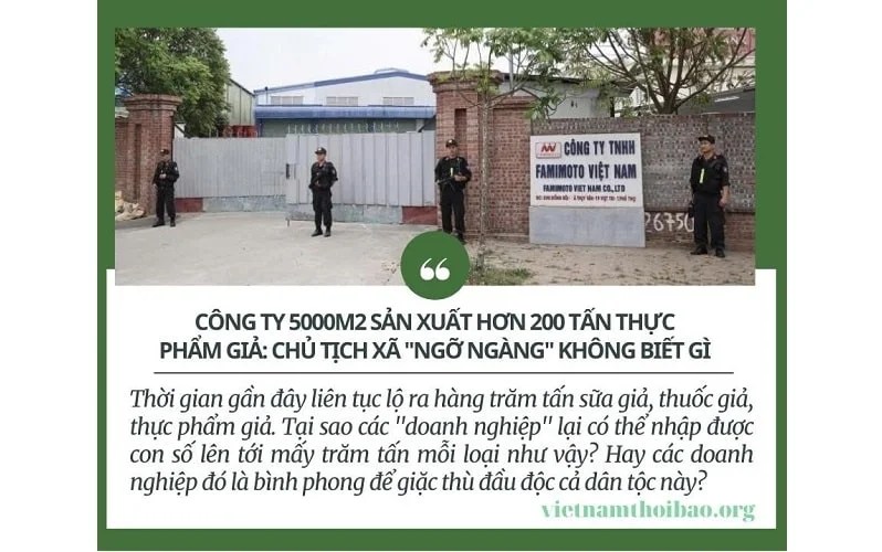 Điều đáng chú ý là khi phát hiện ra mấy trăm tấn thực phẩm giả này thì lãnh đạo xã tỏ ra ‘ngỡ ngàng’ và không biết gì về hoạt động của công ty. Mặc dù công ty này thành lập từ tháng 3/2019, có khuôn viên và nhà xưởng rộng khoảng 4.000 – 5.000m2.