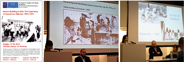 Cuộc hội thảo về công cuộc kiến quốc trong thời chiến của Việt Nam Cộng hòa 1955-1975 tại trường Đại học UC Berkeley, tháng 10 năm 2016. Trái, bích chương cuộc hội thảo; giữa và phải, hai diễn giả trình bày phần nghiên cứu một số sinh hoạt dân sự tại miền Nam trước 1975. (Ảnh tư liệu Trùng Dương)